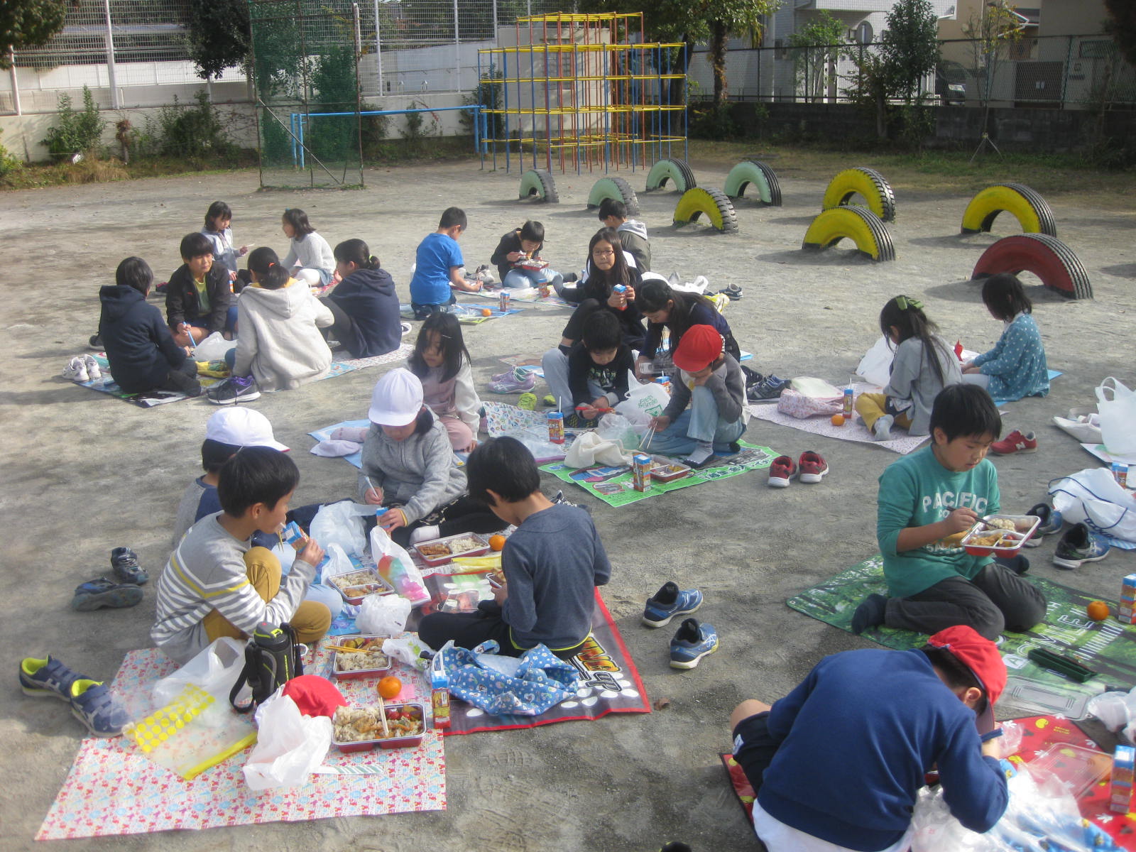 班ごとに校庭や教室でお弁当を食べました。6年生が上手にリードしながら、準備が整った班から食べ始めました。風がなく、気持ちよくお弁当を食べることができました。お弁当が食べ終わると班ごとに、ドッジボール、鬼ごっこなどで遊んでいました。