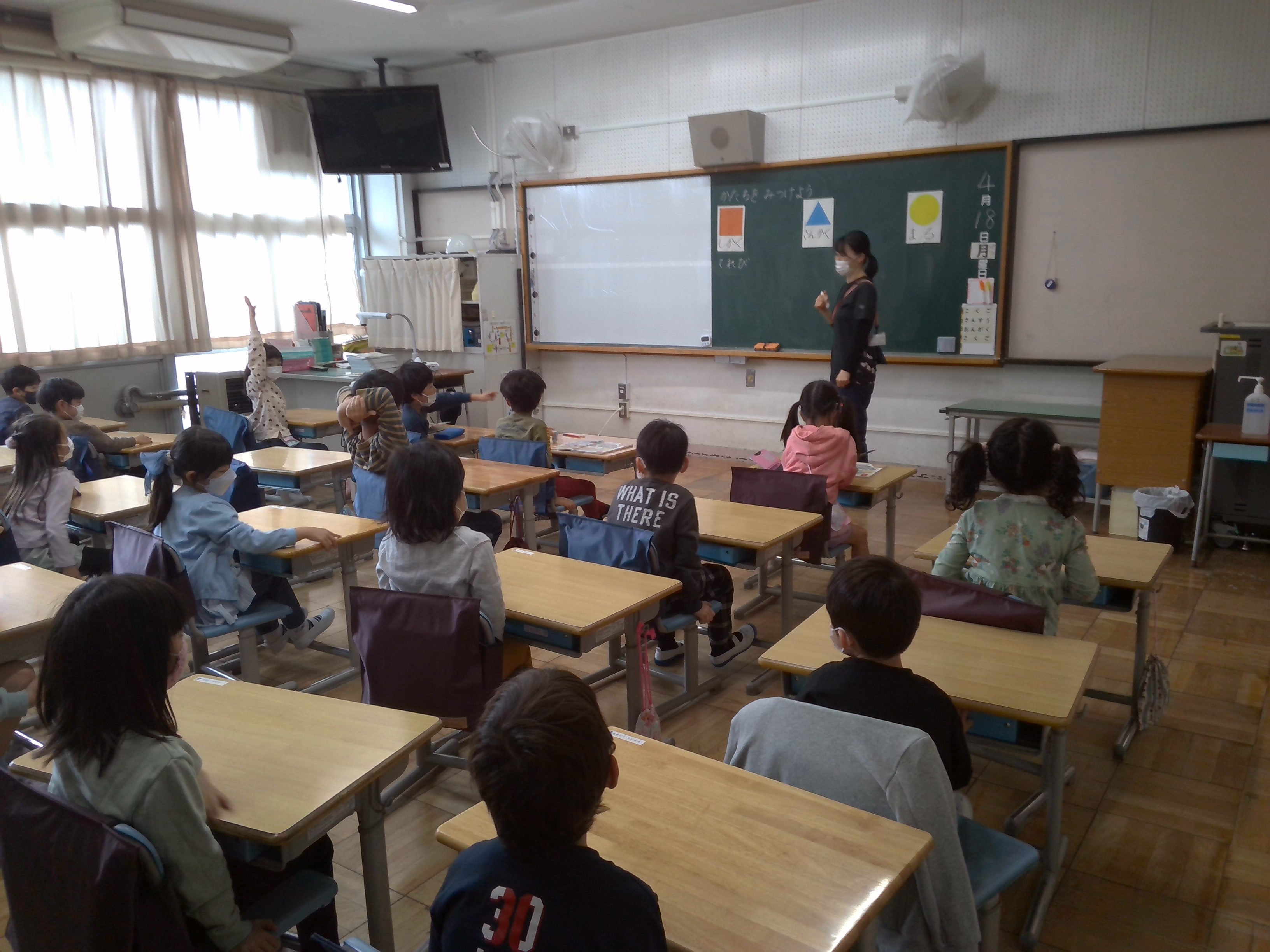 1の2は算数で、「なかよし あつまれ」の学習をしていました。身の回りにあるいろいろな形を探して発表していました。