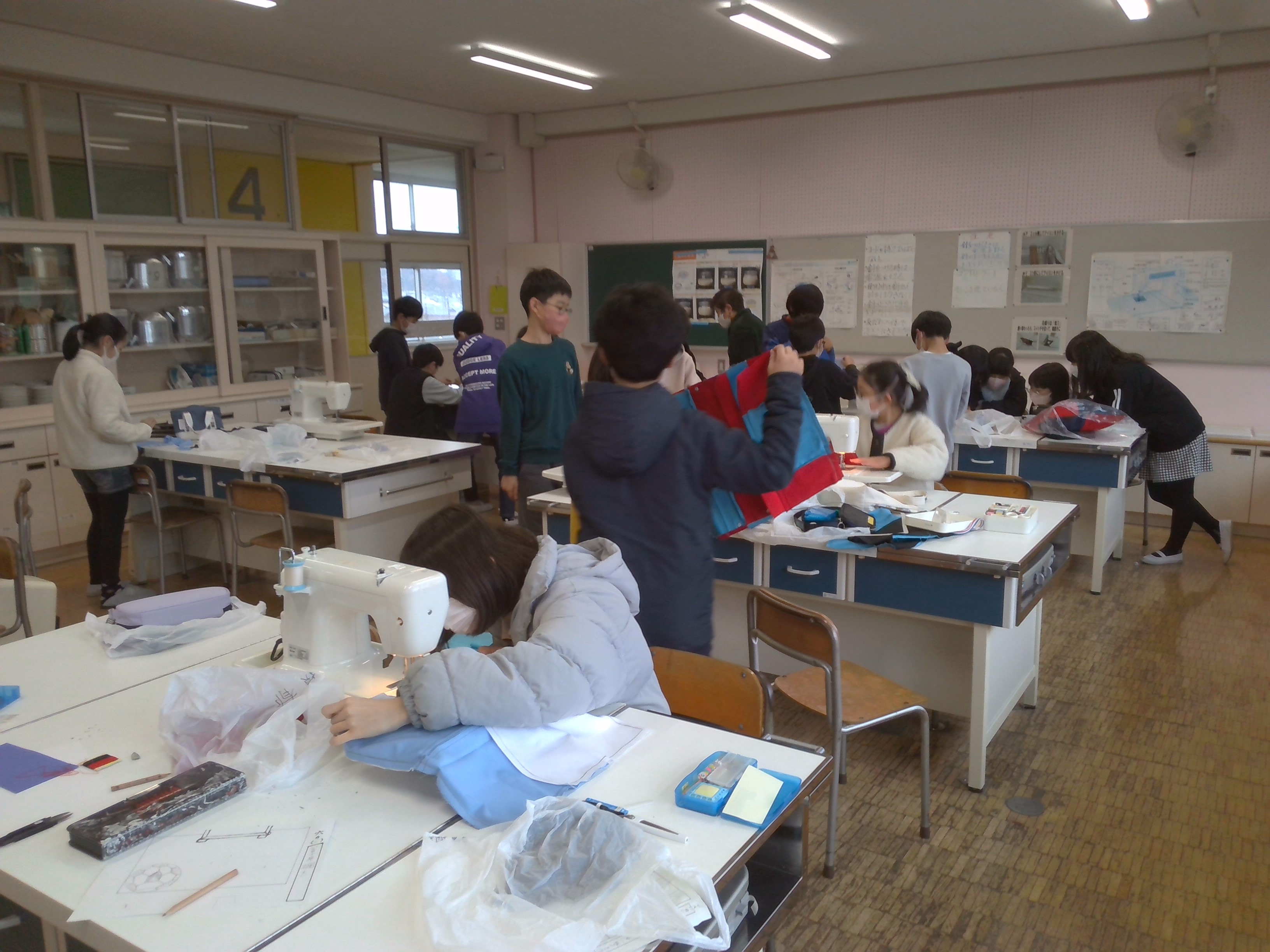 3・4校時、6の2は家庭科で「クッションカバー作り」をしていました。